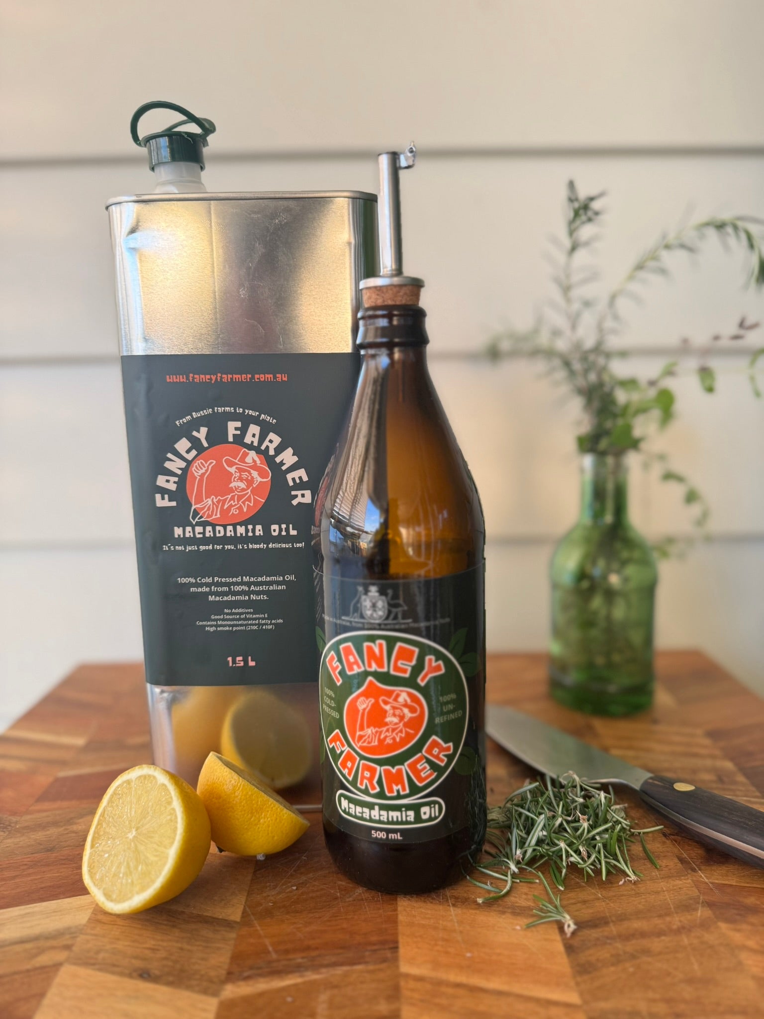 But that’s the beauty of it – you get to fill it with whatever you like. Vinegar, salad dressing, something mysterious from the Fancy Farmer recipe page… but if you really want to impress your mates, you’ll pour in Fancy Farmer Macadamia Oil.
