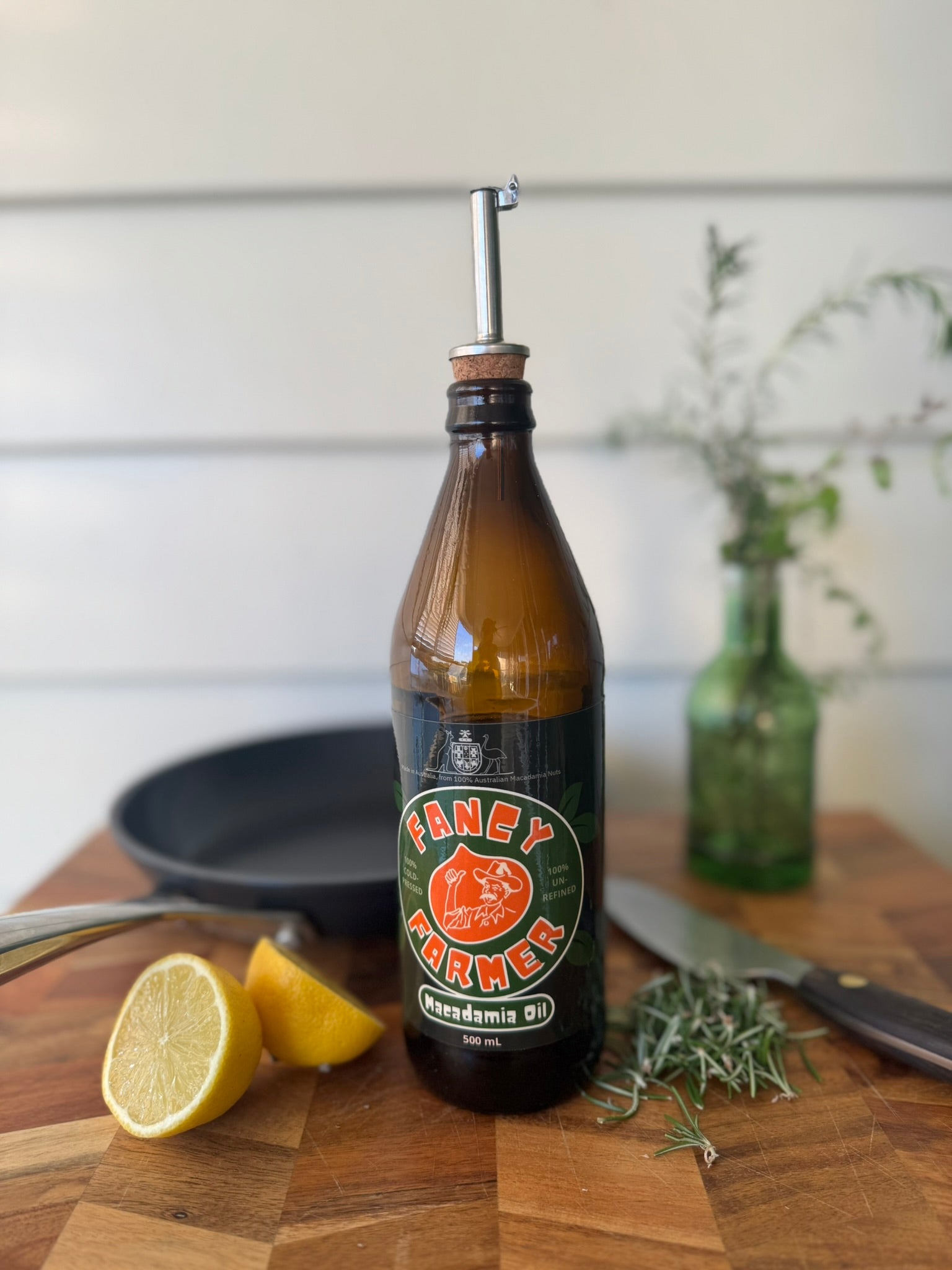 Why? Because you get to choose what goes in it. Olive oil, vinegar, your mate’s homebrew chilli sauce… but let’s be honest, if you really want to impress your friends at the table, you’ll fill it with Fancy Farmer Macadamia Oil.